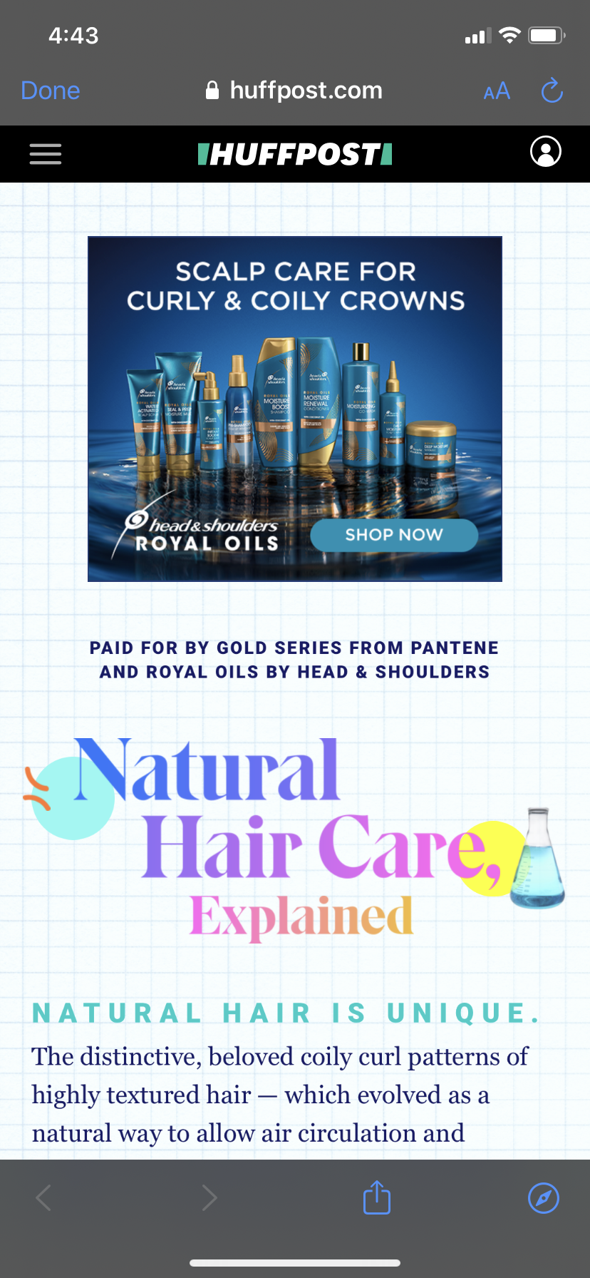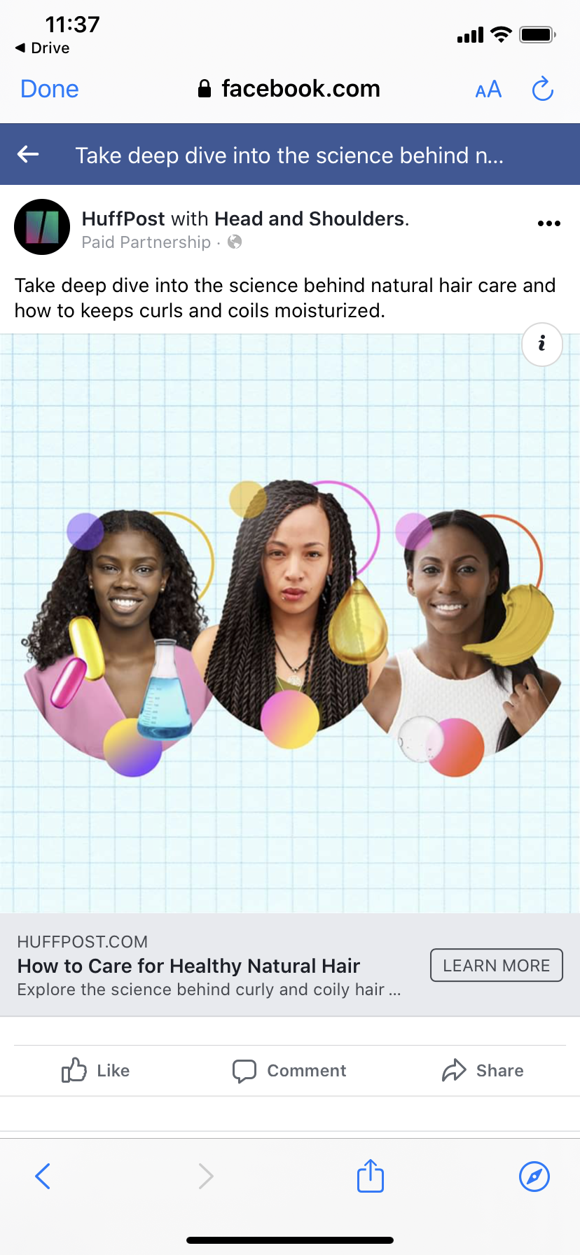 The campaign featured three highly visual, interactive articles enriched with custom, unique illustrations that captured the essence of personal hair journeys, the cultural significance of Black hairstyles, and expert advice on natural hair care. A curated destination hub and a high-profile HuffPost sponsorship during Black History Month amplified the campaign’s visibility. I also collaborated closely with our events team and P&G’s brand team to ensure seamless on-site integration of products and branding at a live community event, enhancing the audience experience.
